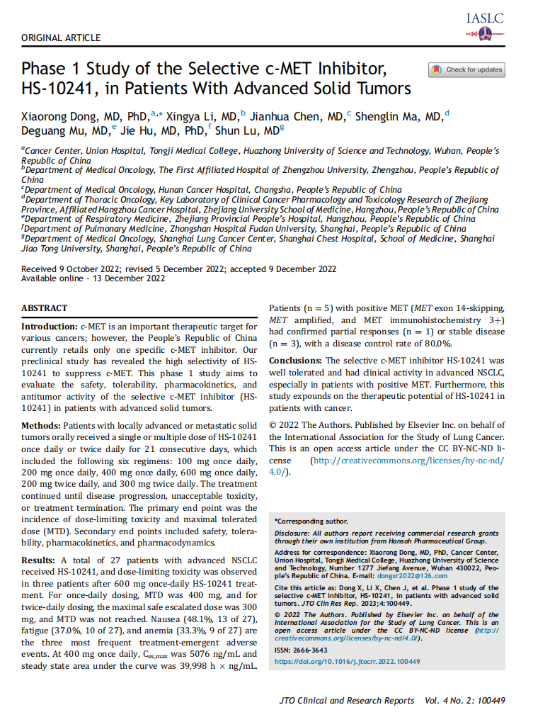 权威发布 | 翰森制药1类创新药MET抑制剂I期临床数据在JTO子刊发表