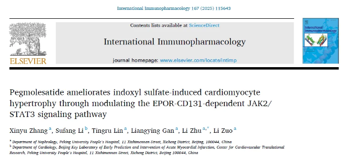 近日,北京大学人民医院肾内科团队在《国际免疫药理学》(International Immunopharmacology,IF:4.7)杂志上发表了一篇有关翰森制药自主研发的创新药培莫沙肽(商品名:圣罗莱®)的机制研究,揭示了圣罗莱®具有心血管保护作用,其能够通过抑制促红细胞生成素受体(EPOR)-CD131异二聚体的形成,阻断JAK2/STAT3信号通路激活,从而改善硫酸吲哚酚(IS,慢性肾脏病的一种关键毒素)诱导的心肌细胞肥大。