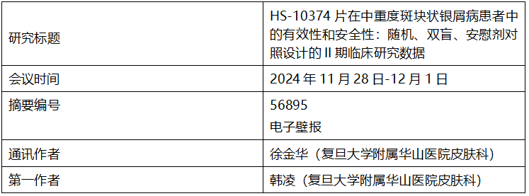 CDA 2024 | 翰森制药TYK2抑制剂HS-10374用于治疗中重度斑块状银屑病的Ⅱ期临床研究积极数据发布